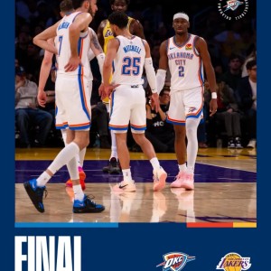 虎扑04月08日讯 今日NBA常规赛:湖人87-123不敌雷霆。赛后,雷霆社媒分享本场比赛获胜海报。获胜后,雷霆常规赛战...