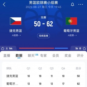 8月27日男篮欧锦赛传来战报,葡萄牙队以62-50战胜捷克队。本场比赛中两队进攻效率普遍偏低,葡萄牙男篮全场68次出手命...
