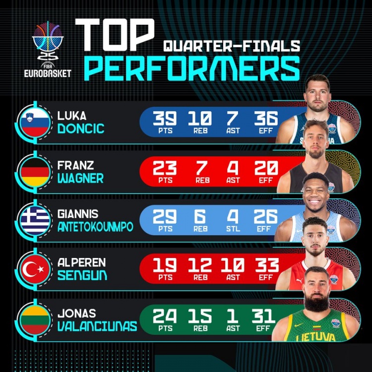 赛事官方推特在八强战结束后分享了多位球员的精彩数据: